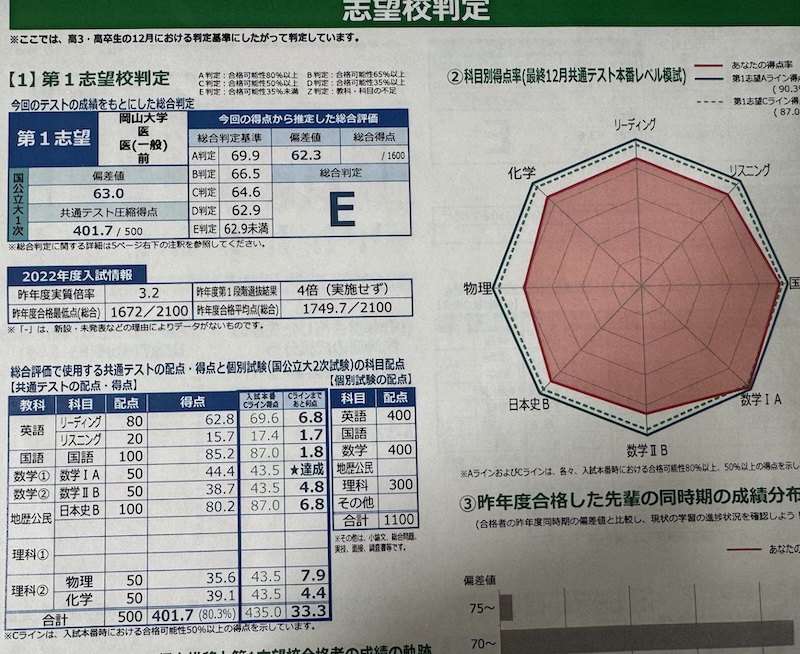 医学部は共通テストで高得点が必要なので、12月の時点でもE判定が出ます。