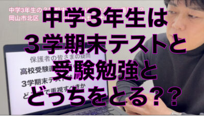 24 1月, 2026 動画:中3生は3学期末テストと受験勉強どっちを取るか? エイムゼミナール塾長の田地野です。 本日は、以前から投稿の中でよく見られている中3生向けの記事を、 Youtubeで解説しました。 3学期末テストと受験勉強はどちらを取るべきかを動画で解説しています。 ↓クリックすると、Youtubeが開始します 共有:Tweet